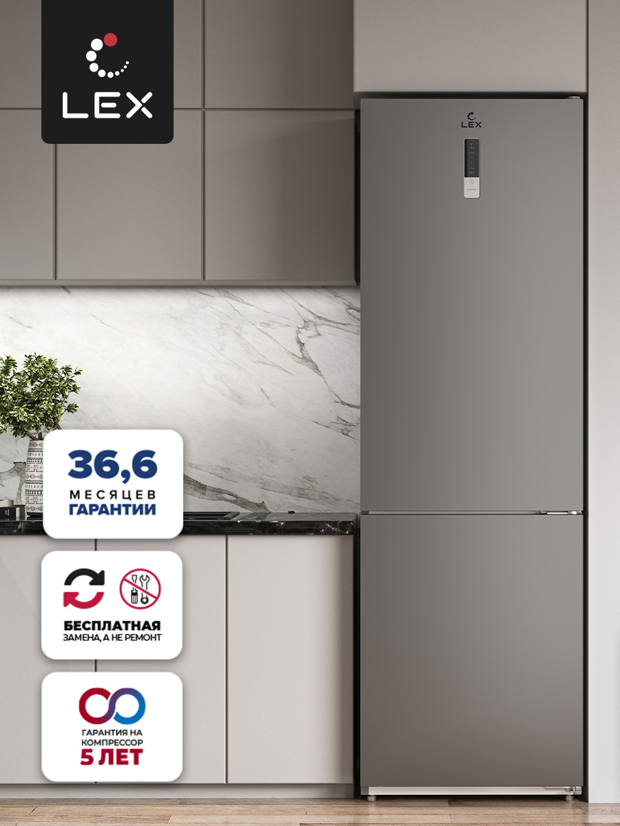 Холодильник LEX LKB188.2 оснащен современным инверторным компрессором, который гарантирует эффективную и практически бесшумную работу. Он также обеспечивает низкий расход энергии и долго поддерживает температуру без электропитания. Технология Total No Frost значительно упрощает обслуживание и помогает устанавливать оптимальную температуру и влажность.